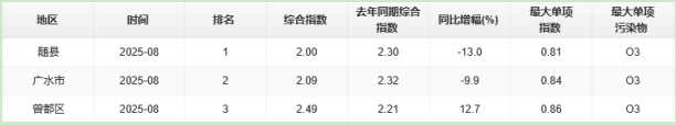 2025年8月,随州市空气监测数据:可吸入颗粒物(PM10)平均浓度值为32μg/m3,较去年同期升高18.5%;细颗粒物(PM2.5)平均浓度值为20μg/m3,较去年同期升高5.3%;二氧化硫(SO2)平均浓度值为6μg/m3,较去年同期无变化;二氧化氮(NO2)平均浓度值为11μg/m3,较去年同期升高120%;一氧化碳(CO)第95百分位值为0.9mg/m3,较去年升高12.5%;臭氧(O3)8小时最大值日第90百分位值为138μg/m3,较去年同期无变化。