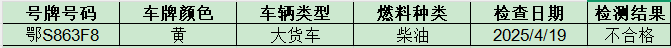 2025年4月,经随州市生态环境部门对在用机动车尾气排放进行遥感检测,发现以下1台(次)随州籍车辆尾气排放不合格(见下图)。根据《中华人民共和国大气污染防治法》等相关法律、法规规定,现将车辆明细予以告知,请车辆驾驶员或车主(车属单位)自本告知发布之日起10个工作日内,对车辆进行维修并通过尾气排放检验,确认合格后方可上道路行驶。